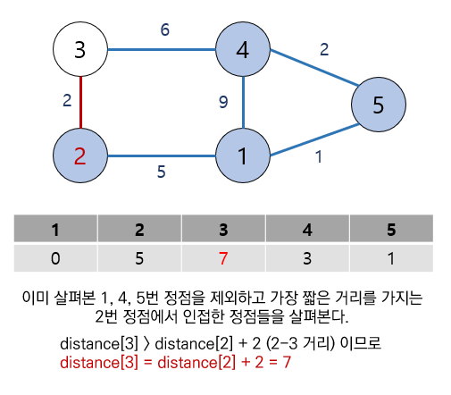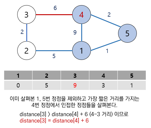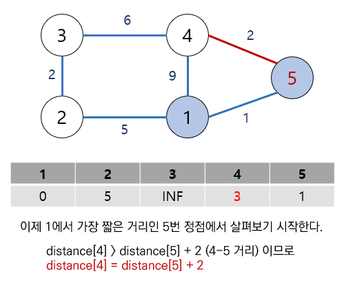 즉, 원래의 distance[4]는 9이지만 distance[5] = 1과 5에서 4로 이동하는 거리 2를 더하면