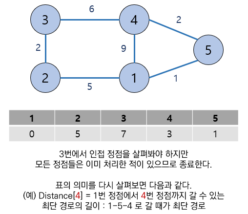 따라서 위의 예시에서는 5번 노드를 방문하여 다시 거리를 계산한다.