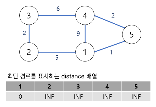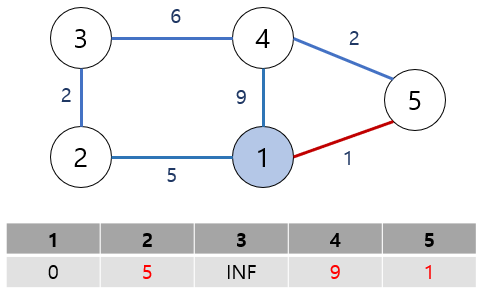 1번 노드에서 본인의 거리는 0이므로 0으로 업데이트한 뒤 나머지 노드까지의 거리는 무한대로 설정한다.