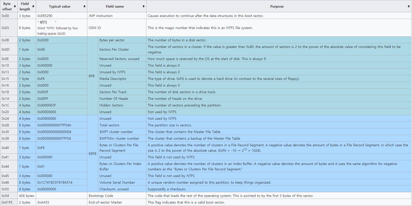 NTFS는 파일 시스템을 인덱스하기 위해 B-tree를 사용하고 부트 섹터(VBR)는 다음과 같다.