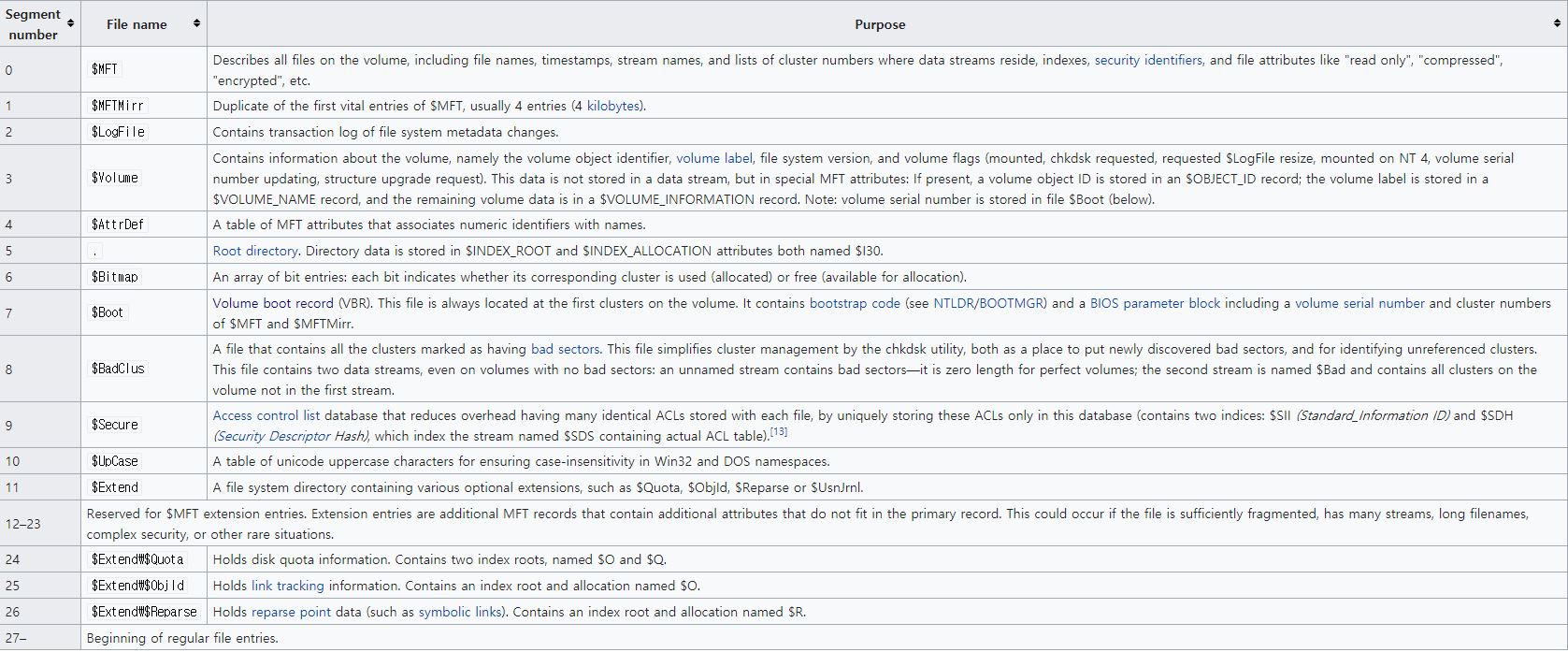 NTFS의 메타 파일의 목록은 다음과 같다.