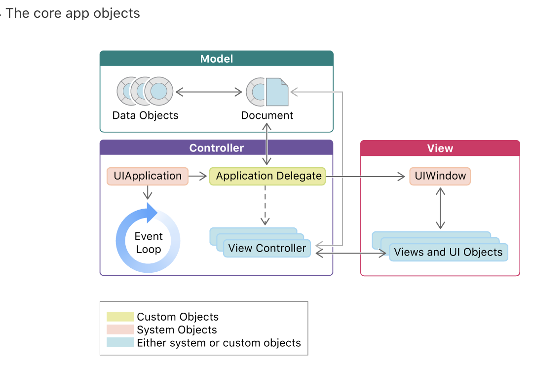 iOS 앱의 객체 관계는 MVC 패턴에 기반하고 있다. MVC 패턴이란 Model - View - Controller의 3개의 핵심 구조를 이용하여 애플리케이션을 설계하는 것을 말한다. Model은 데이터를 담당하고, View는 데이터에 대한 화면 표현을 담당하며, Controllers는 Model과 View 사이에 위치하여 데이터를 가공하여 View로 전달하고, View에서 발생하는 이벤트를 받아 처리하는 역할을 담당한다.