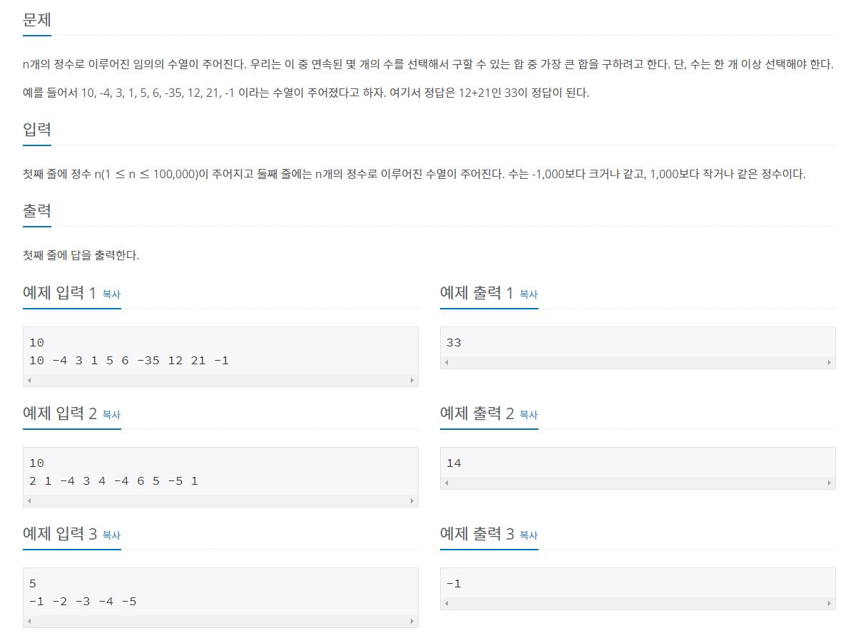 연속된 몇 개의 수의 합 중 최댓값을 구하는 문제이므로 현재값과 누적된 값 + 현재값 중 어떤 것이 더 큰지